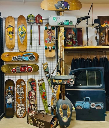 Passionné par la décoration et profondément ancré dans la kustom Kulture, j'aime détourner, personnaliser et donner une âme aux supports, qu'ils soient corporels ou matériels. Cette culture de la création sur mesure influence mon travail au quotidien et m'encourage à repousser sans cesse les limites de mon style. Chaque projet est pour moi une nouvelle occasion d'exprimer ma créativité et de transformer une idée en une oeuvre singulière.
